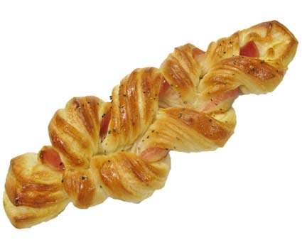 - カマンベールチーズ風味のシートを折り込んだ生地でベーコンを巻き込んで焼き上げました。食卓ロールサイズから焼き調理まで幅広く使用できる汎用性のある生地です。