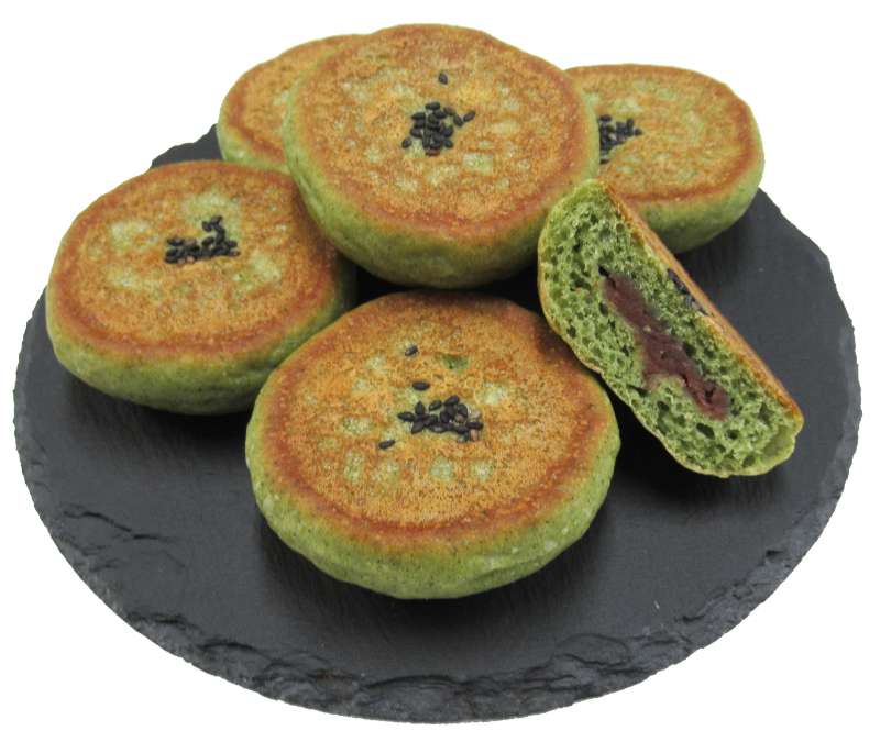 - よもぎパウダーを練り込んだもちもち食感の生地でつぶあんを包みました。
